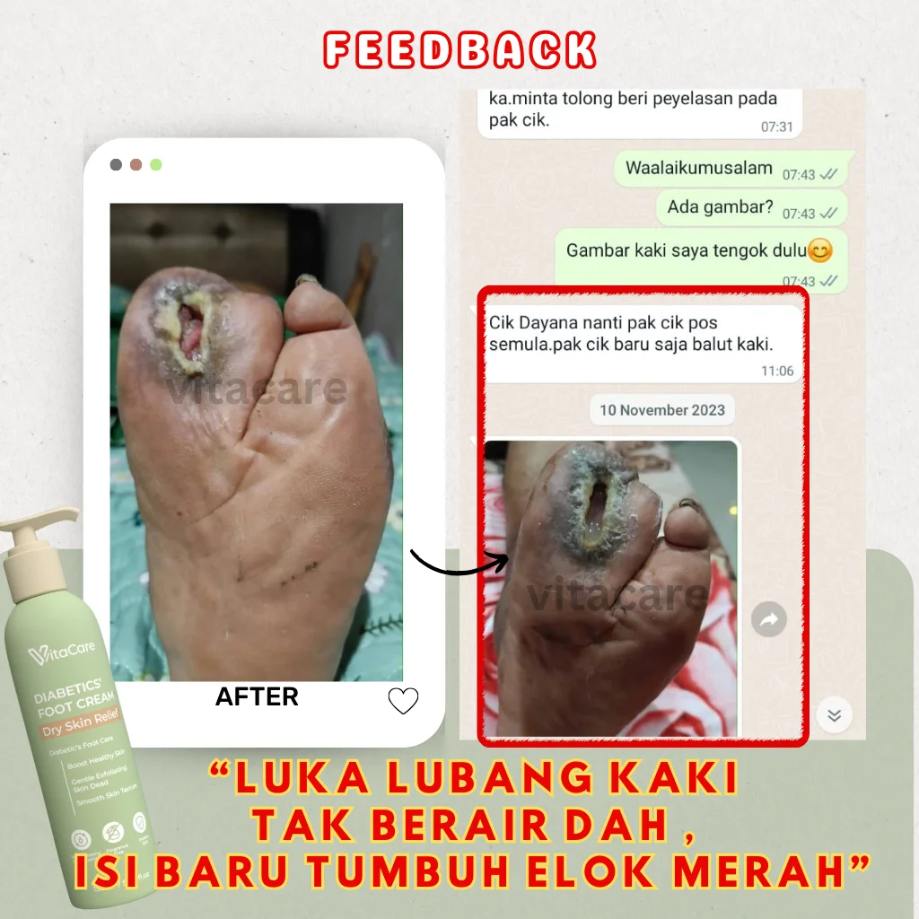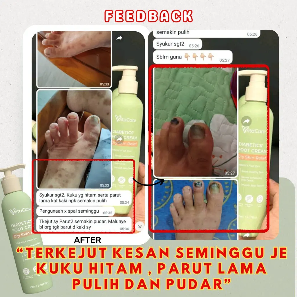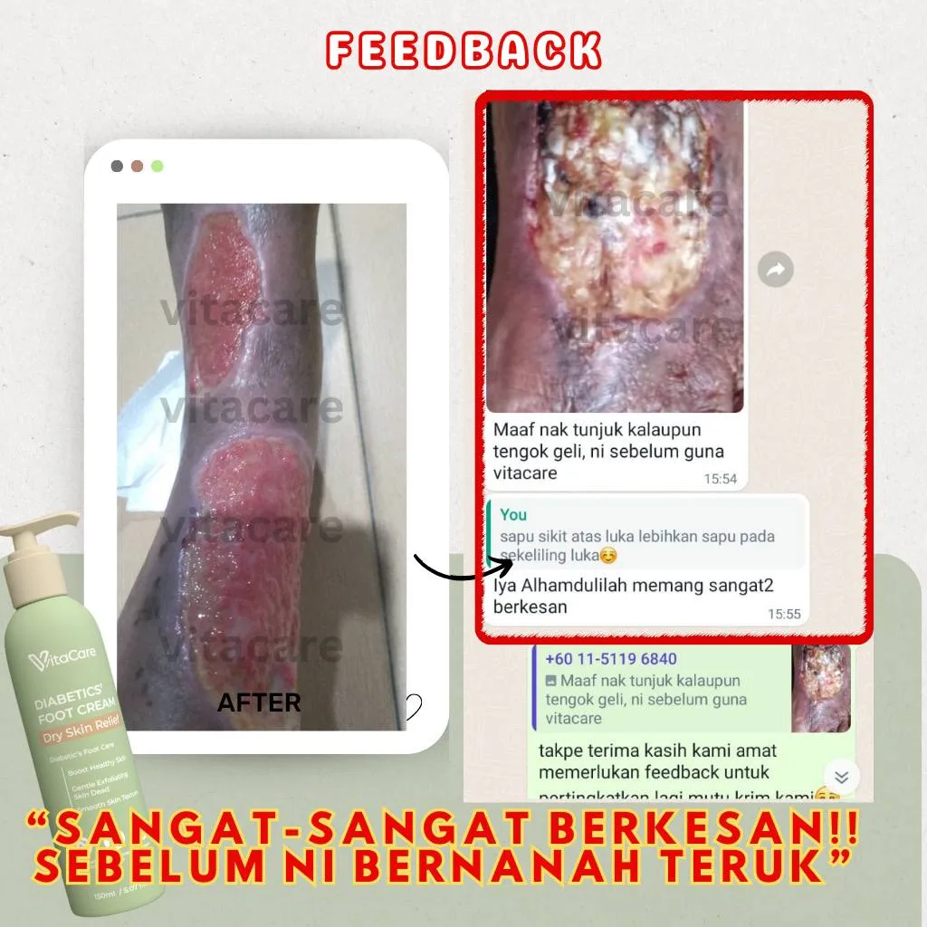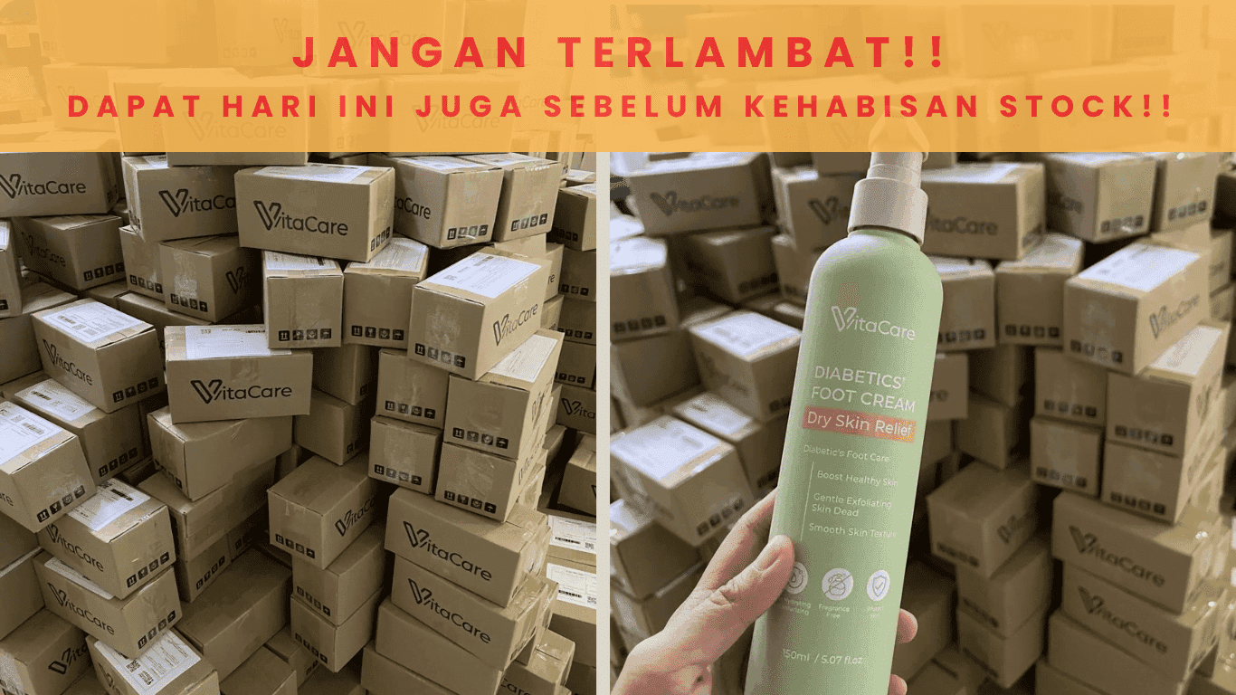 Hampir 80% Pesakit Diabetis Mengalami Komplikasi Masalah Kulit Kering,Bersisik,Gatal Dan Merekah. Aloe Vera Dan Ceramide dalam Vitacare Akan Memastikan Kulit Kaki Pesakit Sentiasa Dalam Kondisi Lembap dan Sihat
