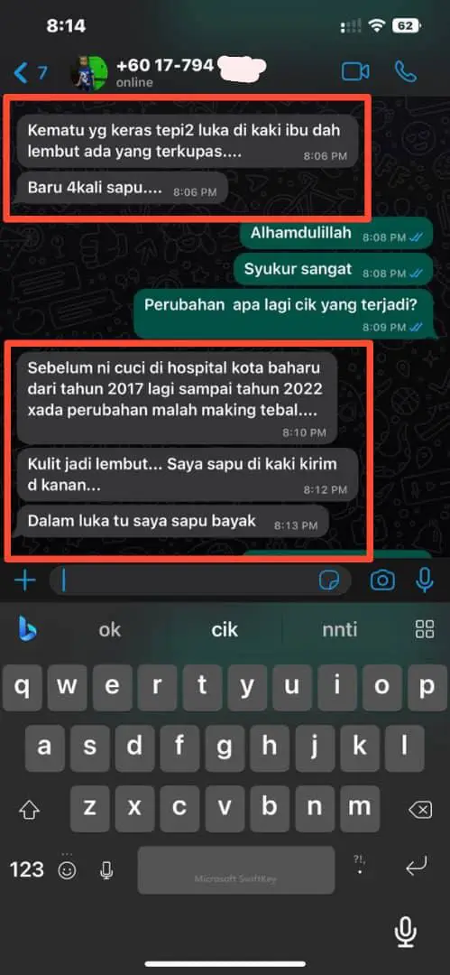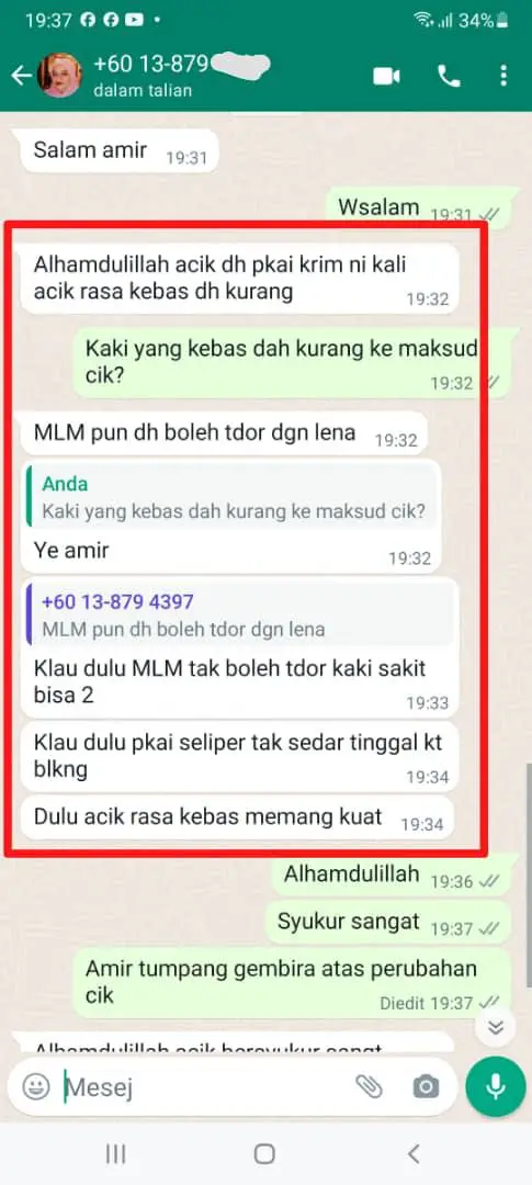 Keadaan kaki Abah masa tu sangat teruk. Hari-hari Doktor desak untuk potong kaki. Tapi kami cuba ikhtiar cara luar. Alhamdulillah, dapat sembuh sebab guna krim ni.